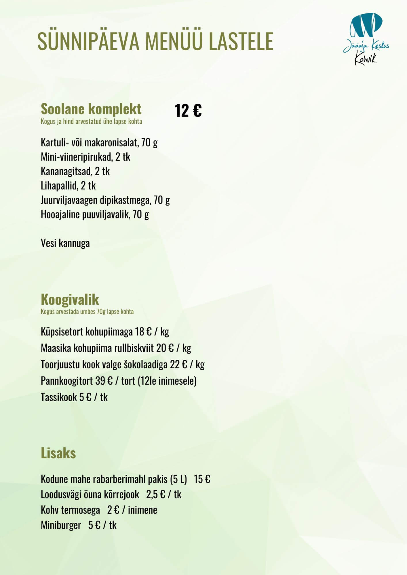 Jääaja Keskuse kohvik pakub ka erimenüüd laste sünnipäevadeks.